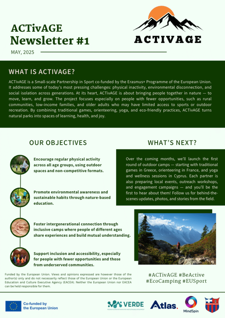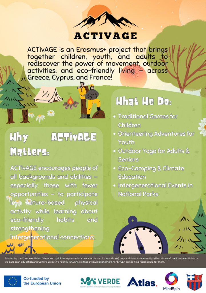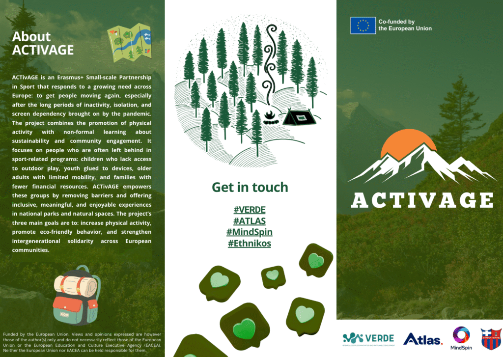 ACTivAGE is an Erasmus+ sport project that envisions communities where children, youth, adults, and older people come together in outdoor spaces, learning from one another through movement, play, and care for the environment. It aims to contribute to a more inclusive, sustainable, and socially cohesive Europe, using the power of sport and non-formal education to strengthen the European values of cooperation, respect, and equity.